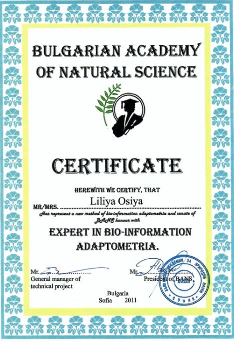 Сертификат об обучении получен в Болгарской Академии в 2011 году, о том, что Лилия является экспертом